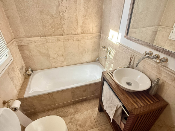 La piscina, revestida en venecitas, incorpora una playa húmeda y un solárium de travertilit, acompañada por una pérgola decorativa. Entre los detalles técnicos y constructivos se destacan las aberturas de PVC con doble vidrio hermético y el sistema de climatización que combina aire acondicionado central frío-calor con equipos splits individuales, ofreciendo confort durante todo el año.
